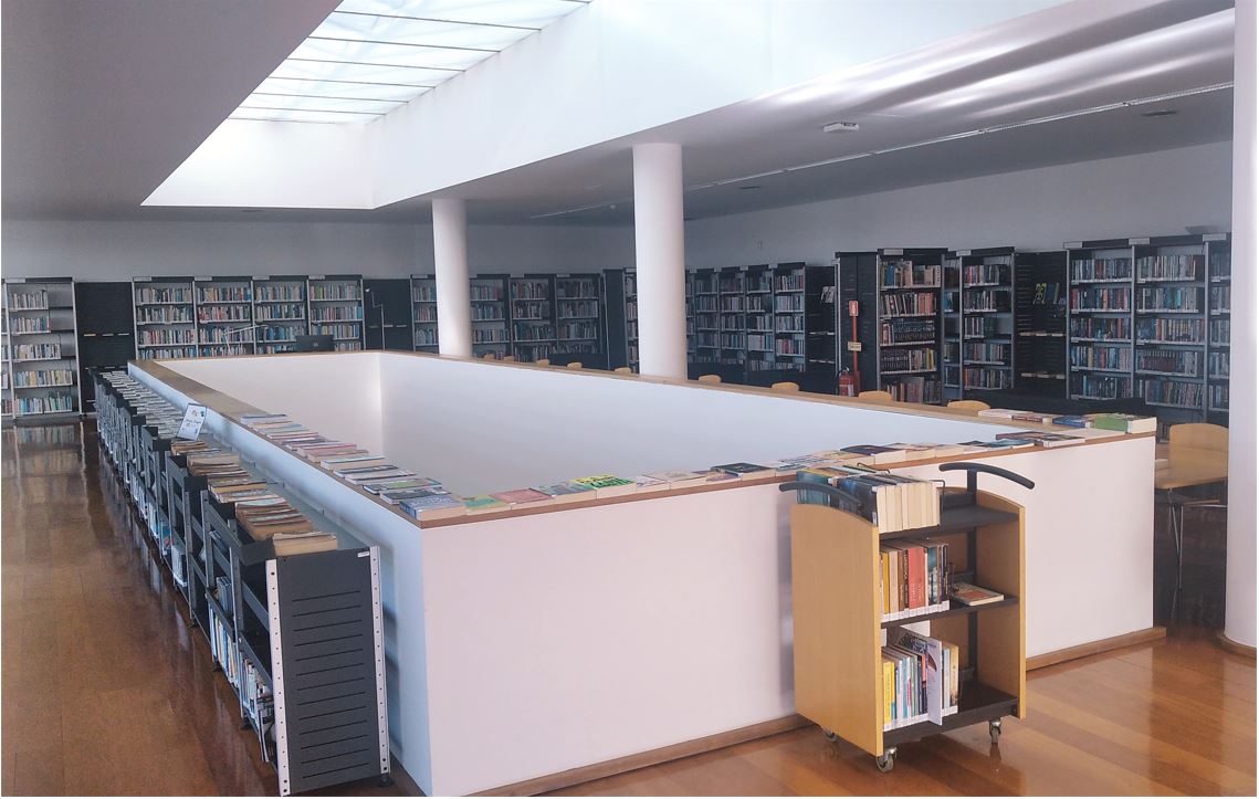 O seu interior é constituído por um mobiliário moderno e funcional, com fácil acesso à informação e um vasto fundo documental de onde se destaca a coleção de literatura infantil.